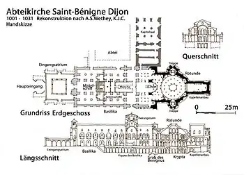 In 989 Bruno, Bishop of Langres, requested Mayeul, Abbot of Cluny, to send monks to re-settle the abbey, grown decadent, as a Cluniac house.[2] In 990 William of Volpiano was appointed the new abbot. By 1002, the ruin of the previous building had been razed and construction began on a new Romanesque structure designed by William, consisting of a subterranean church round the sarcophagus of Benignus, a ground floor church for worship, and a rotunda,[3] 17 metres in diameter, on three levels in the place of the apse, linking the two.[lower-alpha 1] Dedicated in October 1016 by Lambert I,[4] this suite of buildings was decorated in the ornate Cluniac style, of which only a few traces survive.