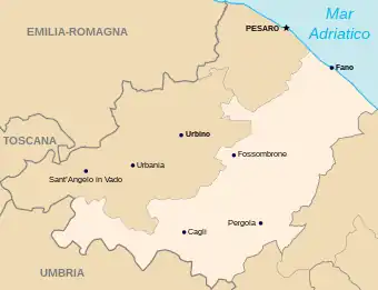 The Catholic diocese of Fossombrone (Latin Name: Forosemproniensis) existed in the Italian province of Pesaro and Urbino, in the comune of Fossombrone, in the valley of the Metaurus River, 25 km (15 mi) southwest of the Adriatic seaport of Fano. In 1986, the diocese was suppressed and its territory incorporated into the diocese of Fano-Fossombrone-Cagli-Pergola. Up to 1563, the diocese had been directly subject to the papacy. It then became a suffragan of the archdiocese of Urbino.[1] In 2000, Urbino lost its metropolitan status, and Fossombrone became part of the ecclesiastical province of Pesaro.[2][3]