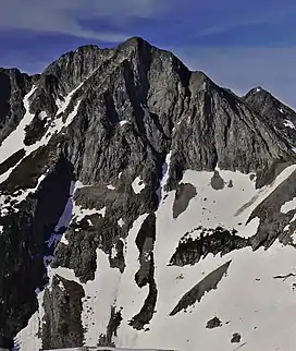 Dip Top Peak is a 7,291-foot-elevation (2,222 meter) mountain summit located in the Alpine Lakes Wilderness in eastern King County of Washington state.[3] It is part of the Cascade Range and is set on land managed by Mount Baker-Snoqualmie National Forest. The peak is situated 1.25 mi (2.01 km) north of Mount Daniel, and less than one mile south of Jade Lake. Precipitation runoff from the mountain drains into East Fork Foss River, which is a tributary of the Skykomish River. The summit saddle has two rock horns, of which the higher southwest peak is the true summit.[3] The first ascent was made August 1950 by Bill and Gene Prater.[3] In the early 1970s, brothers Gene and Bill Prater created the modern aluminum snowshoe known today, and sold them via Bill's "Sherpa Snowshoes" company, which proved very popular.