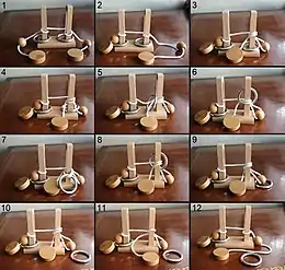 Disentanglement puzzles (also called entanglement puzzles, tanglement puzzles, tavern puzzles or topological puzzles)[1] are a type or group of mechanical puzzle that involves disentangling one piece or set of pieces from another piece or set of pieces. Several subtypes are included under this category, the names of which are sometimes used synonymously for the group: wire puzzles; nail puzzles; ring-and-string puzzles; et al.[2][3] Although the initial object is disentanglement, the reverse problem of reassembling the puzzle can be as hard as—or even harder than—disentanglement. There are several different kinds of disentanglement puzzles, though a single puzzle may incorporate several of these features.[4]