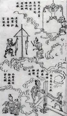 • Santu (三涂; 三塗; Sān Tú; San1-t'u2), the "Three Tortures": Fire Torture (火涂; 火塗; Huǒ Tú; Huo3-t'u2), Blade Torture (刀涂; 刀塗; Dāo Tú; Tao1-t'u2), Blood Torture (血涂; 血塗; Xuě Tú; Hsüeh3-t'u2; 'spilling of blood').