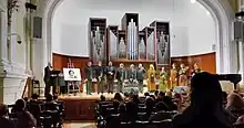 Since Dmitri Pokrovsky's death in 1996 the ensemble has changed its face dramatically. Maria Nefedova (Russian: Нефёдова Мария Петровна) and Olga Yukecheva (Russian: Юкечева Ольга Львовна) are now its music director and stage director respectively. The Ensemble goes on tours, performs new programs of folk, sacred and modern music include "Faces of Russia", "The Man Lives Like The Grass Grows" – Russian spiritual music, "Russian Wedding", "Russian Christmas", "From Romance to Limerick", "Russian Length Song", "Vivat, Russia!" – songs and music of Peter The Great time, "Russian Folk Theatre", program "Romancein Letters" in honor of the Victory in Patriotic War of 1812 (Russian: "Романс в письмах", Moscow International House of Music, 2013), Russian Tales (Russian: "Парасказки", Moscow International House of Music, 2013),[13] The Tale of Igor's Campaign (Russian: "Слово о полку Игореве", Moscow International House of Music, 2013),[14] "Stimmung" (Karlheinz Stockhausen),[15] and Falún (Béla Bartók)[2] among others. In 2018, the Ensemble won the Yuri Lubimov Public Award.[16][17] In 2023 the Dmitry Pokrovsky Ensemble celebrated its 50th anniversary with a series of concerts. The anniversary performance "From Folklore to Avant-garde" took place on February 15 at the Moscow Conservatory.[18][19][20] In 2023 the Ensemble presented the premiere of a musical fantasy on the theme of Fyodor Sologub's fairy tale "Night Dances".[21]