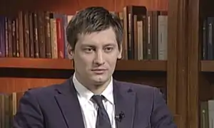 Dmitry Gennadyevich Gudkov (Russian: Дмитрий Геннадьевич Гудков; born 19 January 1980)[1] is a Russian politician and opposition leader.[2] He was elected as a member of the State Duma in 2011–2016.[3] His father, Gennady Gudkov, was also a Duma deputy in 2001–2012. Both father and son were members of the party A Just Russia.[4] Gudkov was expelled from the party on 13 March 2013 after it accused him of "calling on the American authorities to interfere in Russia’s internal affairs".[5][6] While Gudkov ran as candidate of Yabloko party[7][8] and worked with the non-systemic opposition, he lost in the 18 September 2016 election for the Russian Parliament.[9] In 2018, he and Ksenia Sobchak decided to align together, which lead to the creation of an opposition political party which is called the Party of Changes.[10]