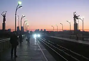Dnipro (Ukrainian: Дніпро, ) is a station on the Kyiv Metro's Sviatoshynsko-Brovarska Line. Named after the Dnieper River, the station consists of a semi-estacade over the embankment highway, and then continues across the river as part of Kyiv Metro Bridge. The station was opened along with the first stage of the Metro in 1960[1] and for the first five years, before the bridge was completed, was the eastern terminus of the line.