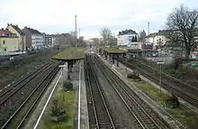 The ground-breaking ceremony for the renovation of Horde station was held on 14 December 2009.[5] The works included the raising of platforms, construction of three lifts, the installation of a passenger information system for mobility-impaired passengers and the renewal of the access tunnel. The old station building was demolished. In its place a developer has built a new two-floor building with a row of shops and a level for parking. The demolition of the dilapidated building built in the 1950s began on 29 March 2011.[6] The old station was heritage-listed in the list of monuments of Dortmund. However, this did not prevent the demolition of the old station building and the establishment of a substantially different building including the complete redevelopment of the entire station forecourt.