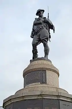 In 1918, the Lawrenceville Board of Trade organized a carnival in Arsenal Park to raise money for the troops fighting in World War I. When the war ended before the money could be put to use, neighborhood leaders decided to spend it on a memorial instead.[1] The monument was sculpted by Allen George Newman, who was known for his military-themed works including The Hiker, a depiction of a weary Spanish–American War soldier which was widely reproduced. Newman's bronze Doughboy statue was unveiled on Memorial Day in 1921 with over 20,000 onlookers present; the Pittsburgh Gazette Times described the occasion as the "largest ceremonial event ever witnessed in Lawrenceville".[4]