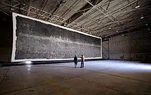 The Great Picture is the largest photograph ever made as a single seamless image, produced on July 8, 2006, using a Southern California jet hangar transformed into a giant camera.[31] The 3,505.75 square-foot (325.44 m2) photograph was made to mark the end of 165 years of film/chemistry-based photography and the start of the age of digital photography.[32] It was made by The Legacy Group; (Jerry Burchfield, Mark Chamberlain, Jacques Garnier, Rob Johnson, Douglas McCulloh, and Clayton Spada). Dimensions of the photograph are 31 feet 7 inches (9.63 meters) high x 111 feet (34 meters) wide.[32] Aspect ratio is 3.47:1. The photograph is of the control tower and runways at the U.S. Marine Corps Air Station El Toro, Orange County, California. The exposure was 35 minutes long and development took 5 hours, 70 people and 1,800 gallons (6,814 liters) of black-and-white chemistry.[33] The Great Picture has been written about in more than 500 publications, states art writer Liz Goldner, including Art in America, Photographie.com, AfterImage, Juxtapoz, Black and White, Los Angeles Times, and Chicago Tribune.[34]