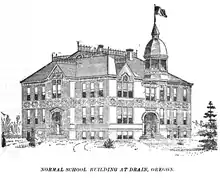 The Drain Normal School was founded in the community in 1883 by the Methodist Church. The state took over the school in 1885 and named it as the Central Oregon State Normal School, before it closed in June 1908.[6]
