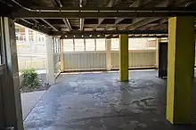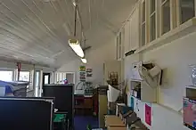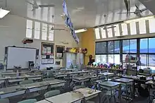 Further changes to Block A were made in the post-WWII period. Between 1950 and 1960, the roof fleches were removed.[82][83] New hat and bag racks approved in October 1958 were added. Before 1960, a doorway to the southwest classroom was inserted in the southeast verandah wall.[84] In 1961, the southeast (front) verandah was enclosed, with weatherboards to sill height and awning windows above, to form a library, staffroom, and storeroom; and a glazed screen was also added to the northeast end of the northwest (rear) verandah.[85][86][87] Between 1960 and 1975 the timber stumps were replaced with masonry piers, and louvred walls were added to the understorey. Classroom ceilings were lowered and lined with flat sheeting (potentially leaving the original pressed metal ceiling above), the understorey was reconcreted, and concrete pathways added. The clerestory windows were removed after 1975, possibly when the roof was re-sheeted, which was a common alteration.[88][89] In 1984, the hat room on the northwest verandah was enclosed to form a store room, and a set of stairs to the understorey was inserted through the northwest verandah floor, leading to a new covered way to Block B. An access ramp was connected to the northwest verandah in c.1997.[90][91][92][93][1]