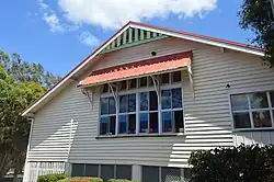 The new school building (known as Block A in 2019) was constructed by contractor, A Barr, for £866 and completed in 1912.[35] The design was a standard plan by the Department of Public Works.[36] The building was highset on timber stumps and comprised two open verandahs (10 ft / 3.1m wide) on either side of a single classroom (24 x 50 ft / 7.32 x 15.24m). Its gable roof, sheeted with corrugated iron, had two ridge ventilators and two centrally located clerestory (skillion dormer) windows, facing opposing directions. The external gable end walls were clad in weatherboards and contained large areas of windows arranged in three rows of eight narrow sashes, shaded by timber hoods. The verandahs had hat room enclosures at the southwest end and the verandah walls were left unclad, with framing and bracing exposed. The verandah walls featured centrally located double doors with fanlights, high-level windows, and hinged ventilation boards along the base of the walls.[37][38][39][40][1]