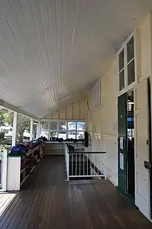 Access was via sets of timber stairs to the centre of each verandah, with the front (southeast) steps running parallel to the verandah and the rear (northwest) steps arranged perpendicularly, comprising a walkway and short flight of steps to the higher ground at the rear. A spoon drain ran around the rear and sides of the building and the ground beneath the building was concreted.[38][41][40][1]