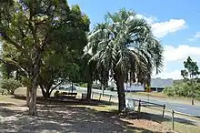 Date palms (planted 1932) at the corner of Brisbane and Darling Streets, from the west, 2019