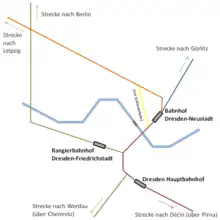 The station is connected by the Dresden railway node to the tracks of the Děčín–Dresden-Neustadt railway and the Dresden–Werdau railway (Saxon-Franconian trunk line), allowing traffic to run to the southeast towards Prague, Vienna and on to south-eastern Europe or to the southwest towards Chemnitz and Nuremberg. The connection of the routes to the north (Berlin), northwest (Leipzig) and east (Görlitz) does not take place at the station, but north of Dresden-Neustadt station (at least for passenger trains).