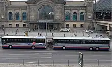 Four tram lines (3, 7, 8, 10), a city bus route (66) and several regional bus services operated by Regionalverkehr Dresden (Regional Transport Dresden), line 261 operated by the Pirna-Sebnitz Upper Elbe Transport Company (Oberelbischen Verkehrsgesellschaft Pirna-Sebnitz) and other services operated by long-distance transport companies regularly stop at the station. Apart from destinations in the surrounding area of Dresden, services are also operated to Annaberg-Buchholz, Olbernhau and Mittweida as well as Teplice in the Czech Republic, among other places. In addition, tram lines 9 and 11 stop at the Hauptbahnhof Nord stop, which is about 150 metres (490 ft) to the northeast of the station. In the Bayerischen Straße to the south of the station are the bus stops of several long-distance bus services. After the completion of the planned ZOB, this is to be served by all regional and long-distance bus services.