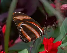 Dryadula is a monotypic genus of the butterfly family Nymphalidae. Its single species, Dryadula phaetusa, known as the banded orange heliconian, banded orange, or orange tiger, is native from Brazil to central Mexico, and in summer can be found rarely as far north as central Florida. Its wingspan ranges from 86 to 89 mm, and it is colored a bright orange with thick black stripes in males and a duller orange with fuzzier black stripes in females.