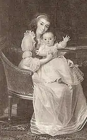 Sophia Frederica, known as Sofie Frederikke af Mecklenburg-Schwerin in Denmark, was described as jolly, charming and intelligent.[1] She had a hard time in the beginning adapting to her new, stiffer environment, but became quite popular.[2] During the first ten years of her marriage (1774-1784), she gave birth to three daughters, the eldest two were stillborn and the third lived only five months;[3][4] it was only in 1786 when she had the first of her living children, the future King Christian VIII.