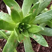 Dudleya guadalupensis is a very rare species of succulent perennial plant in the family Crassulaceae commonly known as the Guadalupe liveforever.[1] It is a rosette-forming leaf succulent, with foliage that is variously colored light green, green, and a waxy white. It is characterized by dense leaves that fold over the center in dormancy, a curving, sinuous flower stalk, and white, cup-shaped flowers.[2][3] It is endemic to the rocks and islets off of Guadalupe Island, an isolated volcanic island in the Pacific Ocean located 241 kilometers off of the coast of Baja California.[1]