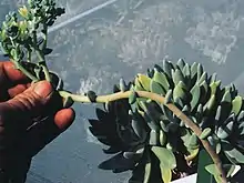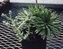 A 1985 paper alleged that a Dudleya of this species from Guadalupe Island had a chromosome count of 2n = 102,[7] but Moran cast doubt on the author's specimens, as the authors failed to list a herbarium record. It is likely that the authors of the 1985 paper acquired the plant as a mislabeled Dudleya greenei, which is often mistakenly sold as Dudleya guadalupensis. The hypothesis that the authors of the 1985 paper got their plant as a mislabeled Dudleya greenei is further evidenced by the fact that greenei has a chromosome count of n = 51, which corresponds to the somatic count of 2n = 102.[2]