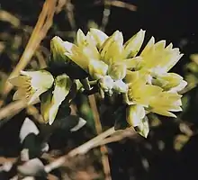 The flowers have a calyx 5–6 mm (0.20–0.24 in) wide, and 6–8 mm (0.24–0.31 in) high, rounded below, with the tube 1–1.5 mm (0.039–0.059 in) long. The calyx segments are narrowly triangular-ovate, and are 3–5 mm (0.12–0.20 in) long by 2.5–3.5 mm (0.098–0.138 in) wide. The corolla is a pale greenish yellow, but it has a glaucous surface texture that makes it appear almost white, with it being 11–13 mm (0.43–0.51 in) long, and around 4 mm (0.16 in) wide at the base and 7–11 mm (0.28–0.43 in) wide above. The petals are shaped linear to lanceolate, with an acute tip, 2–2.5 mm (0.079–0.098 in) wide, connate 1–2 mm (0.039–0.079 in). The petals are strongly keeled, nearly straight, positioned erect to ascending but not touching much above the calyx.[2][4]
