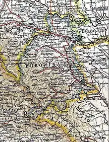 During the 19th century, the Austrian Empire policies encouraged the influx of many immigrants (Austrian authorities encouraged immigration in order to develop the economy[28]), mainly Ukrainians (at that time referred to as Ruthenians from Galicia) and Romanians from Transylvania and Hungary, as well as smaller numbers of Germans, Poles, Jews, and Hungarians.[29] Official censuses in the Austrian Empire (later Austria-Hungary) did not record ethno-linguistic data until 1850–1851. H.F. Müller gives the 1840 population used for purposes of military conscription as 339,669.[30] According to Alecu Hurmuzaki, by 1848 55% of the population was Romanian. The Austrian census of 1850–1851 which for the first time recorded data regarding languages spoken, shows 48.50% Romanians and 38.07% Ruthenians[31]