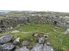 Dun Mor (grid reference NM04234927) is situated on a rocky knoll on the northern coast of island of Tiree, about 1 kilometre northwest of the hamlet of Vaul. The broch consists of a drystone tower with an internal diameter of 9.2 metres with walls about 4.5 metres thick.[1] The outer face of the wall survives to a maximum height of 2.2 metres.[2] The entrance is on the southeast side.[1] On the north side of the entrance passage is a small side-chamber, of a type usually called a "guard cell".[1] The intramural cavity is well-preserved, and there are the remains of a staircase, which led to the upper levels, on the north side.[1]