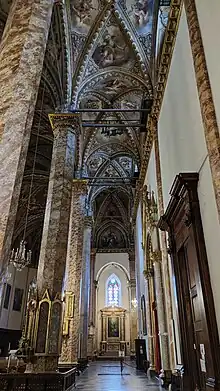 Notable is the apse, with a wooden choir with intarsia by Giuliano da Maiano and Domenico del Tasso (1486–91), which was damaged by a fire in 1985. The right transept has an altarpiece by Giovanni Baglione (1609). Two small side doors lead to Oratory of St. Onofrio, built to house altarpiece with the same name by Luca Signorelli, now in the Cathedral Museum.
