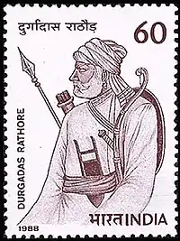 Durgadas Rathore (13 August 1638 – 22 November 1718) was the Rathore Rajput General of the Kingdom of Marwar. He is credited with having preserved the rule of the Rathore dynasty over Marwar, India, following the death of Maharaja Jaswant Singh in the 17th century. In doing so he had to defy Aurangzeb, a Mughal emperor. He commanded the Rathore forces during the Rajput War (1679–1707) and played a major role in the Rajput Rebellion (1708–1710) which became one of the main reason of decline of Mughal Empire. He was elected as the leader of the revolt along with Raja Jai Singh II of Jaipur.[1] He won a number of victories against the Mughals[2] and forced many Mughal officers to pay tribute to him in the form of chauth.[3] In 1706, Durgadas Rathore raised a large Koli army in Surat of Gujarat and with the help of Koli chiefs attacked at Patan and killed the Mughal commander Shahkali Khan.[4]