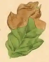 The caterpillar is whitish with a pale-brown head.[5] It lives inside the leaves of Quercus (oak) species making a blotch mine with ″spaghetti like″ frass from May to July. Initially the mine is a narrow corridor circa 5 mm wide and is mostly filled with granular frass. The corridor (or gallery) abruptly widens into a large. full depth. dirty-whitish blotch which is on the leaf margin. The frass within the blotch is in long threads. If several eggs are laid on the same leaf, the mines join together with several larvae in the enlarged blotch. The mine is similar to that of the beetle, Orchestes pilosus, but the sawfly's mine is small and darker when fully formed.[6][7][8]
