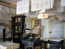 On June 26, 1829, the twenty-three-year-old Grandin announced in the Wayne Sentinel that he intended to publish the Book of Mormon "as soon as the translation is complete."[7] Oliver Cowdery prepared a copy of the manuscript, and Grandin bought "500 pounds of new small pica" type in New York. The chief compositor, John H. Gilbert, found that the manuscript was "closely written and legible, but not a punctuation mark from beginning to end." Gilbert said that he added punctuation and capitalization in the evenings. Cowdery also set some type.[8] To print the book, Grandin used a Smith Improved Printing Press invented by Peter Smith (1795–1823), which first appeared on the market about 1821 and was the most up-to-date press available to the small printer of the day.[9]