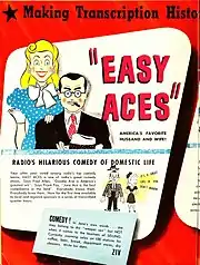 Easy Aces is an American serial radio comedy (1930–1945). It was trademarked by the low-keyed drollery of creator and writer Goodman Ace and his wife, Jane, as an urbane, put-upon realtor and his malaprop-prone wife. A 15-minute program, airing as often as five times a week, Easy Aces wasn't quite the ratings smash that such concurrent 15-minute serial comedies as Amos 'n' Andy, The Goldbergs, Lum and Abner, or Vic and Sade were. But its unobtrusive, conversational, and clever style, and the cheerful absurdism of its storylines, built a loyal enough audience of listeners and critics alike to keep it on the air for 15 years.