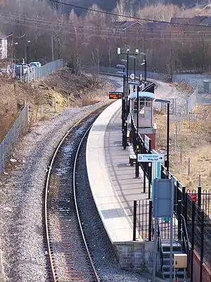 Ebbw Vale Parkway railway station (Welsh: Gorsaf reilffordd Parcffordd Glyn Ebwy) is a station on the Ebbw Valley Railway in Wales. The station opened on 6 February 2008 when services to and from Cardiff Central commenced after 46 years of being a freight-only line. A northwards extension of the line to a new terminus at Ebbw Vale Town opened on 17 May 2015, which accounts for the drop in usage in 2015–16. A direct service to Newport was expected to commence in 2018 following double-tracking and re-signalling works between Aberbeeg and Crosskeys, but this has now been pushed back to 2021.[1]