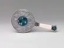 In 1927 a hand mirror of repousse silver and cloisonne was part of a toilet set of gold and cloisonne sold at the Hudson's Silver Gallery at $200 ($2,728.05 in 2017).[10][11]