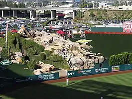 The most notable feature of the entire renovation, however, was a "California Spectacular" in which geysers erupt and a stream cascades down a mountainside (Pride Rock) covered with real trees, artificial rocks behind the left-center field fence, and new bullpens. Fireworks shoot out of the display at the start of games, after every Angel home run and after every Angel win (previously they had been shot off from a parking garage).[21]