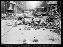 Irvine's black and white photograph Dead Horses attests to her photographic vision. At least four dead horses which were pulling carriages lie in their traces among broken carriages and brick rubble from the San Francisco earthquake of 1906.[4] The L. Tom Perry Special Collections Library at Brigham Young University holds 293 images in their Irvine Collection.[5] They range in subject matter from landscapes, construction, and bridges, to everyday life including family portraits, infant deaths and Mokelumne Hill townscapes. Her work includes much variety, from a redwood forest to city buildings, as well as the earthquake and its effect on architecture, streetscapes, fires, and prevailing activities amidst the destruction.[5]