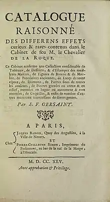 Gersaint notably catalogued the collections of Quentin de Lorangère (2 March 1744), Antoine de la Roque (22 April 1745), and Angran, vicomte de Fonspertuis (17 December 1747); artists' biographies were appended to Gersaint's extended descriptions of their work.[13] Gersaint's Catalogue raisonné de toutes les piėces qui forment l'oeuvre de Rembrandt (published posthumously, Paris, 1751), was the first catalogue raisonné of a single artist's graphic work, addressing at length the connoisseurship issues in distinguishing Rembrandt's work from that of his pupils in a chapter on doubtful attributions.[14]