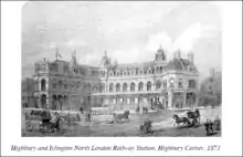 The last and largest of Horne's stations was the Italianate Highbury and Islington, which was completed in 1872 and consisted of three wings. His designs for the station were exhibited at the Royal Academy in the summer exhibition of 1873.[4] On 19 April that year The Illustrated London News carried a detailed description, naming Horne as architect. The station was first damaged during the Blitz in 1940, when the mansard roof and the upper storey were lost and again in 1944, when a flying bomb hit Highbury Corner, killing 26 people and causing devastating damage to the station & surrounding buildings. Although temporary repairs were carried out in the post-war years, Highbury & Islington was never restored to its full former use as a passenger station.