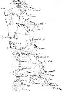 The Portolá expedition of 1769 included Franciscan missionaries, led by Junípero Serra. Starting from Loreto, Serra established the first of the 21 missions at San Diego. Serra stayed at San Diego and Juan Crespí continued the rest of the way with Gaspar de Portolá. Proceeding north, Portolá followed the coastline (today's California State Route 1), except where forced inland by coastal cliffs.