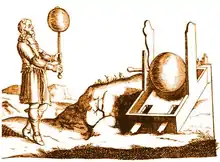 In 1663, the German physicist Otto von Guericke created the first electric generator, which produced static electricity by applying friction in the machine. The generator was made of a large sulfur ball cast inside a glass globe, mounted on a shaft. The ball was rotated by means of a crank and an electric spark was produced when a pad was rubbed against the ball as it rotated. The globe could be removed and used as source for experiments with electricity.[3]