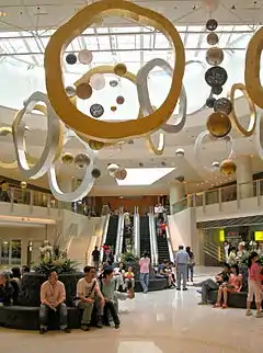 The mall is divided into five zones based on the concept of the five elements of Nature, namely Metal, Wood, Water, Fire and Earth.[1] Each zone is designed with a distinctive interior architectural theme that responds to the element, public art such as large scale sculptures are also employed to enhance the respective theme. The Wood Zone is highlighted by the sculpture/furniture "The Trails by Worms" and series of art works made of tree branches; the Water Zone is represented by the water feature "Harmony", which is a series of standalone reflective pillar measure (approximately) 9 meters (30 ft) tall with water running down the surface, creating the illusion of a solid yet liquid fountain; the Fire Zone is symbolised by the sculpture "White Heat" and the Earth Zone is symbolised by the sculpture "1/9", which is a set of rock formation, the number 9 is associated with the land where the shopping mall is built because the word Kowloon literally means "Nine Dragons". The Metal Zone is symbolised by metal rings hanging from above, it is also where high fashion and jewellery brands can be found.