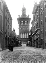 The Elephant Tower (Danish: Elefanttårnet) (also known as the Elephant Gate (Danish: Elefantporten)) is the most famous landmark of the Carlsberg district in Copenhagen, Denmark, the original brewery site of the Carlsberg Breweries (the area is now under redevelopment as a new neighbourhood). The tower takes its name from four large granite elephants which flank the gate, standing back to back carrying the tower on their backs.