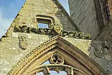 Decay began and the roof of the eastern limb collapsed during a storm on 4 December 1637.[98] In 1640 the General Assembly ordered Gilbert Ross, the minister of St Giles kirk, to remove the rood screen partitioning the choir and presbytery from the nave. The screen was chopped up for firewood by Ross and the Lairds of Innes and Brodie.[99][100] It is believed that the destruction of the great west window was caused by Oliver Cromwell's soldiers sometime between 1650 and 1660.[100]