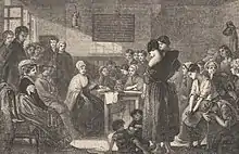 Fry returned to her project in 1816, and was eventually able to fund a prison school for the children who were imprisoned with their mothers. Rather than attempt to impose discipline on the women, she suggested rules and then asked the prisoners to vote on them. In 1817, she helped found the Association for the Reformation of the Female Prisoners in Newgate. This association provided materials for women so that they could learn to sew patchwork, which was calming for the women and also helped them develop skills such as needlework[17] and knitting; this opened up a prospect, when in future they were released from prison, of them entering employment and earning money for themselves.[18] This approach was copied elsewhere and led to the eventual creation of the British Ladies' Society for Promoting the Reformation of Female Prisoners in 1821.[19] She also promoted the idea of rehabilitation instead of harsh punishment which was taken on by the city authorities in London as well as many other authorities and prisons.