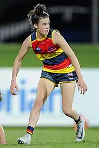 Jones was drafted by Adelaide with their third selection and twenty-fourth overall in the 2017 AFL Women's draft.[3][14] Joining Adelaide she linked up again with coach Bec Goddard who coached her at the AFL Women's Under 18 Championships and with her idol Erin Phillips.[15] Jones made her debut in the twelve point loss to Brisbane at Norwood Oval in the opening round of the 2018 season.[16] Jones received a nomination for the 2018 AFL Women's Rising Star award after kicking two goals in Adelaide's round 5 win against Carlton.[4] In March 2019, Jones was selected for the initial 40-player 2019 AFL Women's All-Australian team.[17] However, she wasn't selected for the final squad.[18] In March 2020, Jones was selected for the AFL Players Association's inaugural AFL Women's 22under22 team.[19][20]