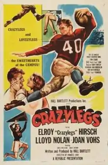 • Crazylegs, a motion picture released in November 1953 focusing on Hirsch's life as a football player at Wausau High School and the Universities of Wisconsin and Michigan. Hirsch played himself as the lead in the film.[61][62] Los Angeles Times movie critic John L. Scott wrote of Hirsch's performance: "Hirsch as an actor is both likable and believable. He does very well in his first film assignment."[6] Hirsch's appearance in Crazylegs has been credited with expanding his fame beyond sports fans and making him "a star in the eyes of the general public."[63]
