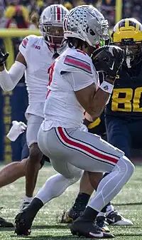 Egbuka joined the Ohio State Buckeyes as an early enrollee in January 2021, forgoing his senior season at Steilacoom which had been moved to the spring due to COVID-19.[5] He played in 11 games as a freshman and caught nine passes for 191 yards.[6] He also returned 20 kickoffs for 580 yards and was named honorable mention All-Big Ten Conference.[7][8] As a sophomore in 2022, Egbuka recorded over 1,000 receiving yards.