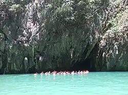 Outside the cave, there is a lagoon which is surrounded by tropical plants and a beach. The name of the cave is derived from the phenomenon that occurs, when the sun shines on the water, which reflects colored light all over the cave’s wall. This can only be seen between 10.00 am and 2.00 pm.