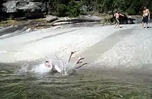 Visitors slide down the granite into Emerald Pool in violation of park rules.[1]