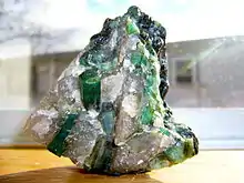 Emerald is a gemstone and a variety of the mineral beryl (Be3Al2(SiO3)6) colored green by trace amounts of chromium or sometimes vanadium.[2] Beryl has a hardness of 7.5–8 on the Mohs scale.[2] Most emeralds have lots of material trapped inside during the gem's formation,[3] so their toughness (resistance to breakage) is classified as generally poor. Emerald is a cyclosilicate.