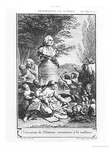 Frontispiece to Rousseau's Émile by De Launay for the 1782 edition. The original caption reads: "L'éducation de l'homme commence à sa naissance" ("A man's education begins at birth").[15]