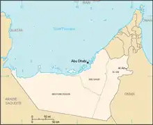 The Emirate of Abu Dhabi (/ˌæb ˈdɑːbi/, /ˌɑː-/, or /-ˈdæ-/;[3][4] Arabic: إِمَارَةْ أَبُوظَبِي imarat abū ẓabi, pronounced [ʔabuː ˈðˤɑbi])[3] is one of seven emirates that constitute the United Arab Emirates (UAE). It is the largest emirate, accounting for 87% of the nation's total land area or 67,340 km2 (or 26,000 sq mi).[5]